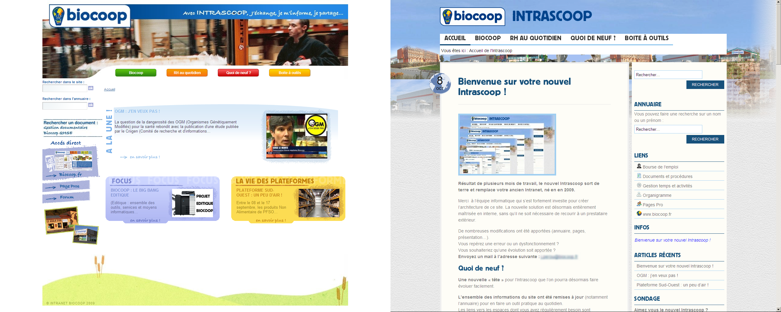 Refonte de l’Intranet de Biocoop : Passage au système de gestion de contenu WordPress et personnalisation du thème Bueno par WooTheme aux couleurs de Biocoop. Reprise de données et création / normalisation du Document Object Model (DOM). Installation de quelques plugins pour augmenter le périmètre fonctionnel et ajouter de l’interactivité. A gauche de l’agrandissement, l’ancienne version, à droite, la nouvelle.